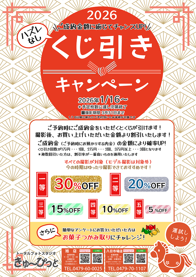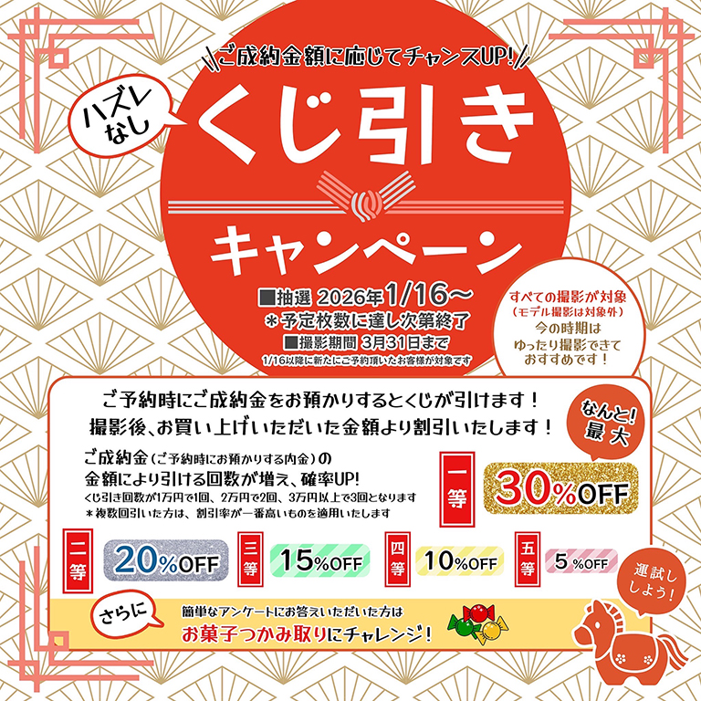 🎯 2026 くじ引きキャンペーンスタート! ご予約時にご成約金をいただくと ハズレなしの割引く